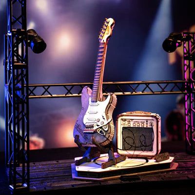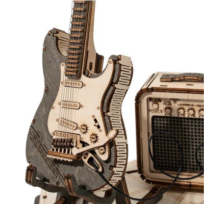 弦やアンプのコードに別素材を使用し、蛇腹パーツによってエレキギターの複雑なフォルムが再現された、完成度の高いウッドパズルです!